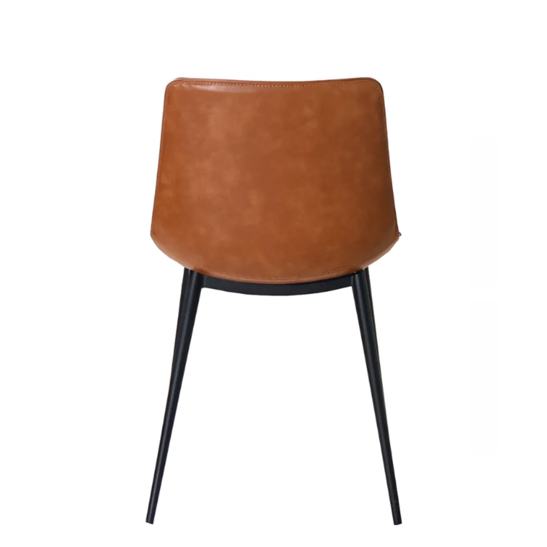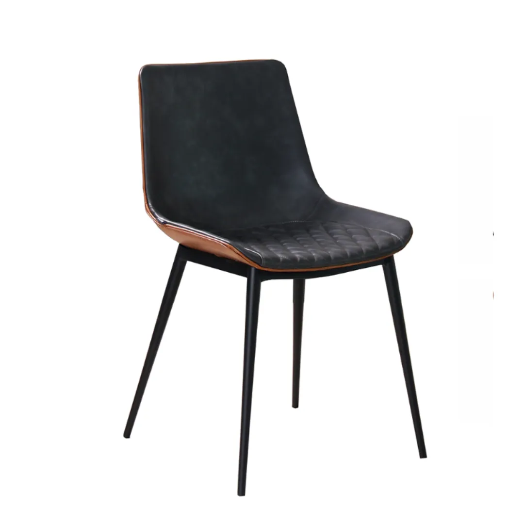 Cadeira com estrutura metálica e assento revestido em couro. O detalhe em madeira nas laterais adiciona sofisticação ao design moderno e elegante.