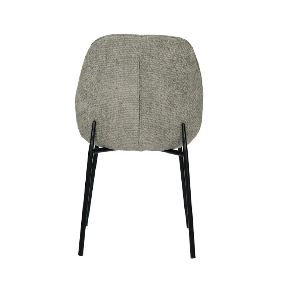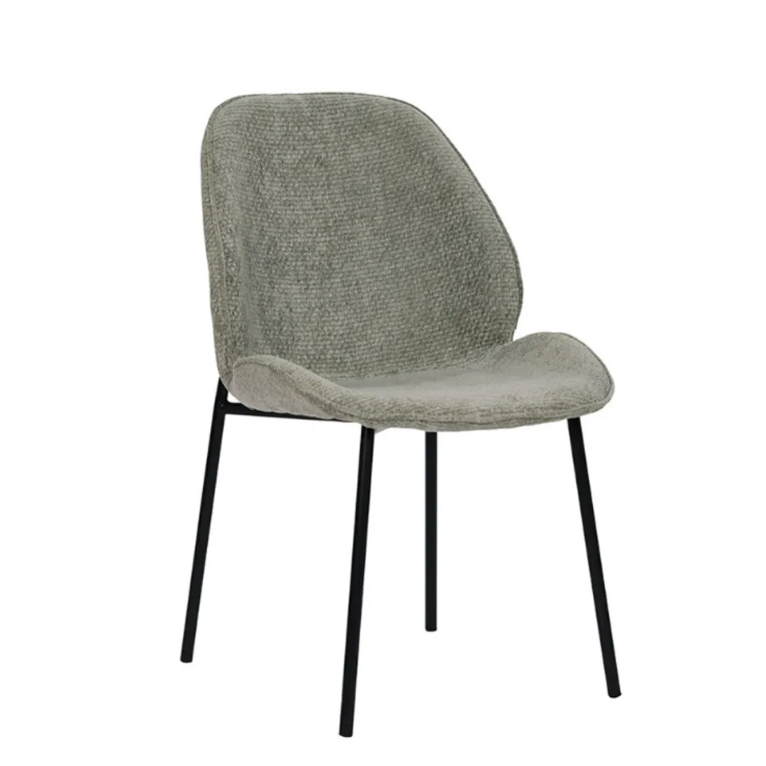Cadeira de design contemporâneo com encosto curvo e assento em tecido. Leve, confortável e versátil, com estrutura metálica que equilibra elegância e praticidade.