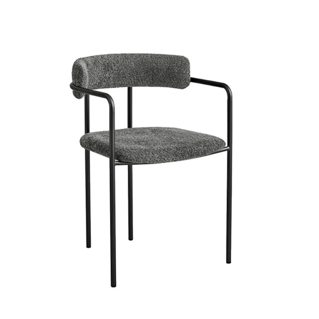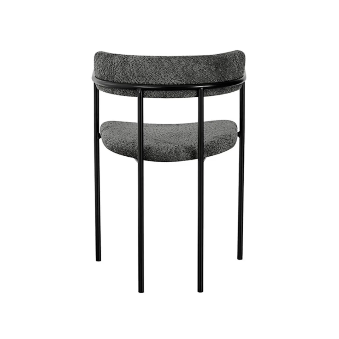 Cadeira com estrutura metálica e design minimalista. Possui encosto curvo e assento estofado em tecido, oferecendo conforto com um toque contemporâneo e sofisticado. Ideal para ambientes modernos e versáteis.