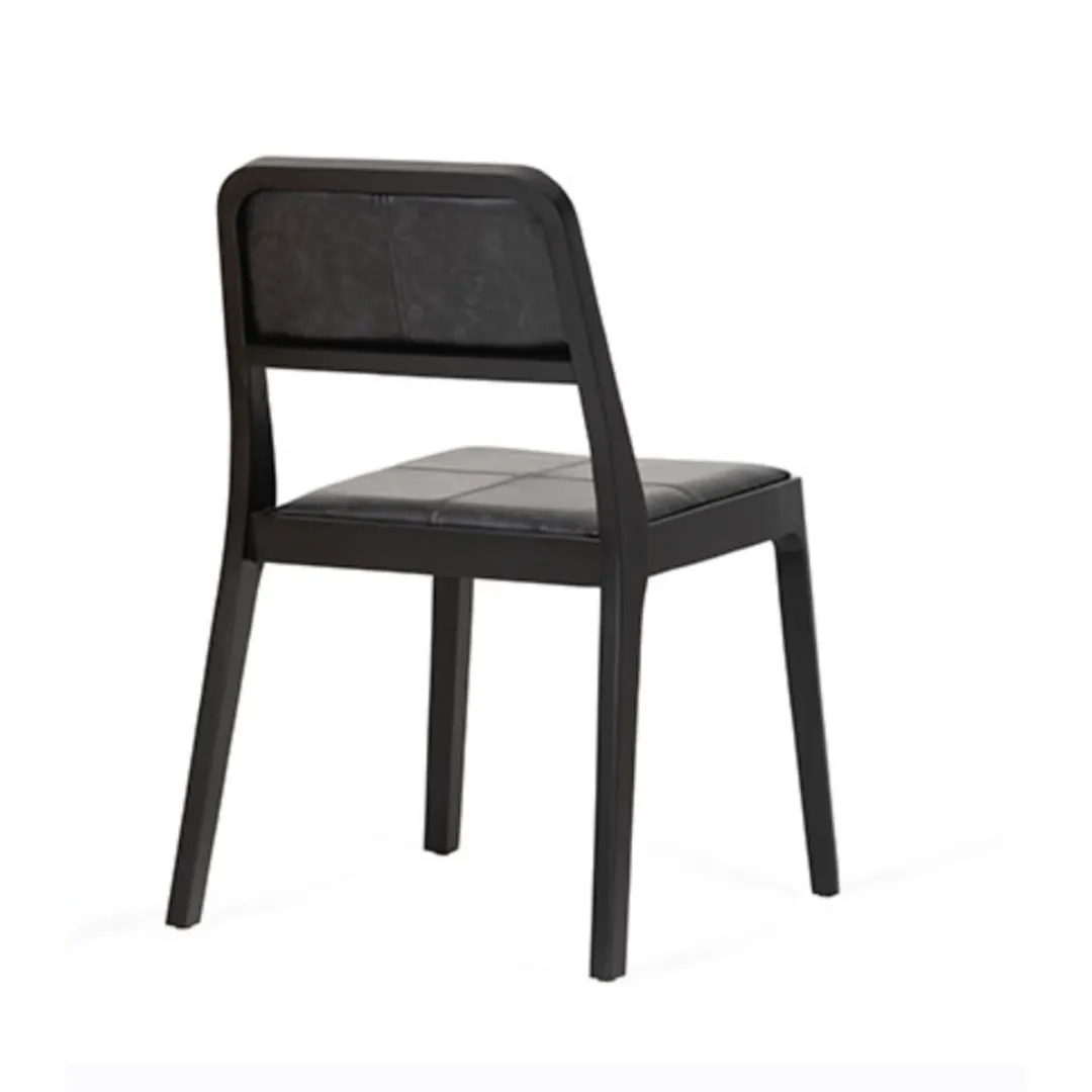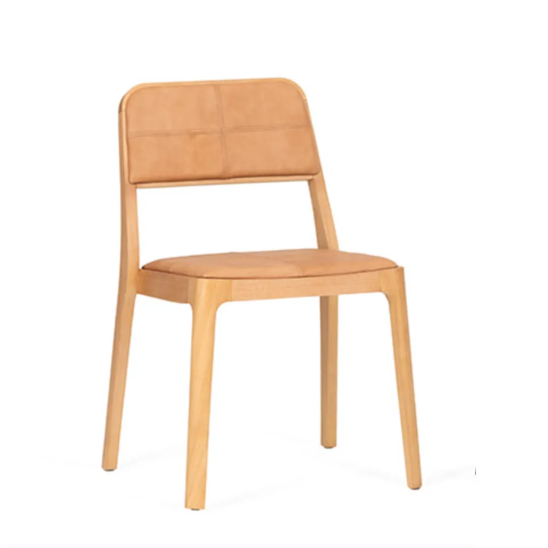 Cadeira com estrutura em madeira e assento e encosto estofados em couro. O design é simples e contemporâneo, com costuras aparentes que valorizam os detalhes e trazem um toque de sofisticação atemporal.
