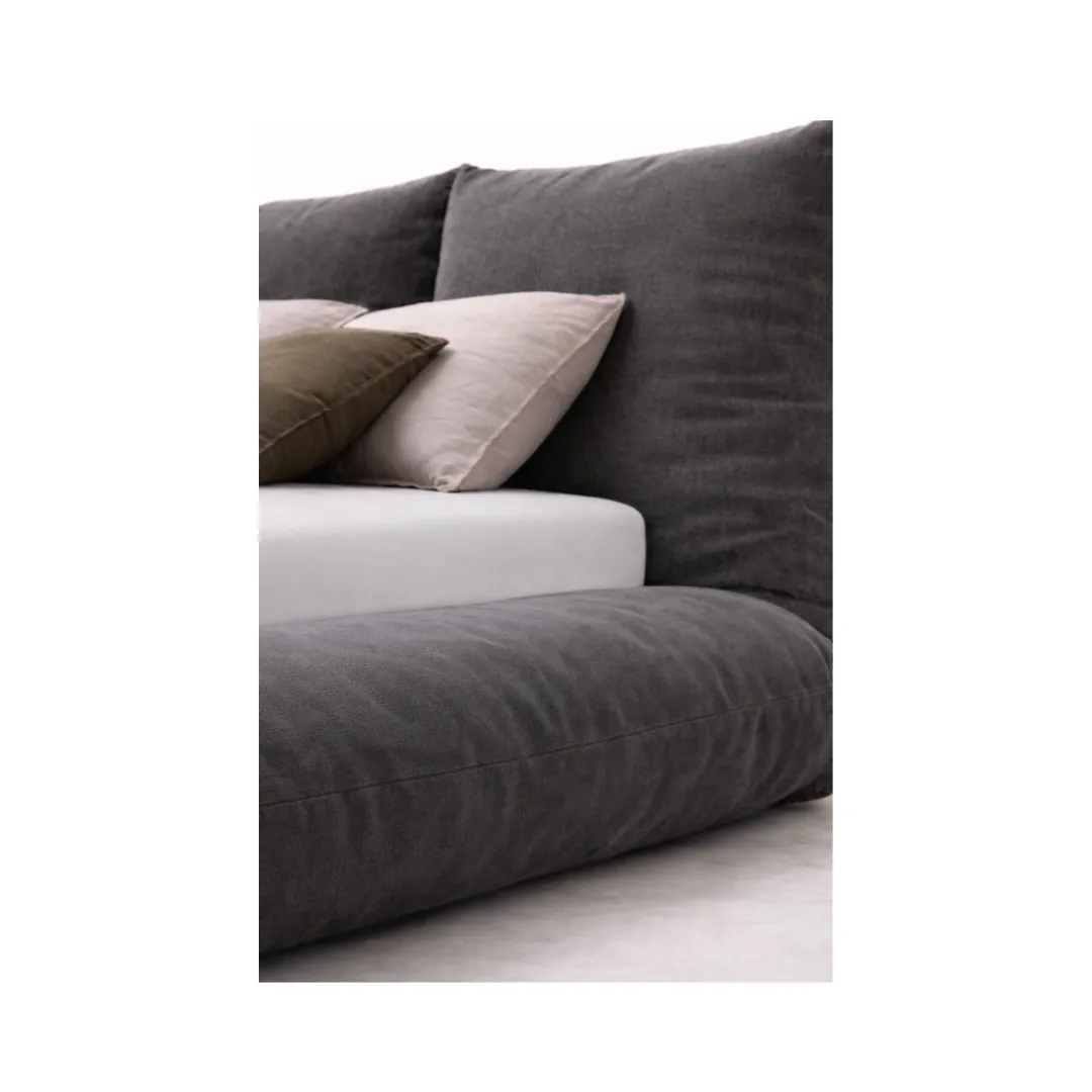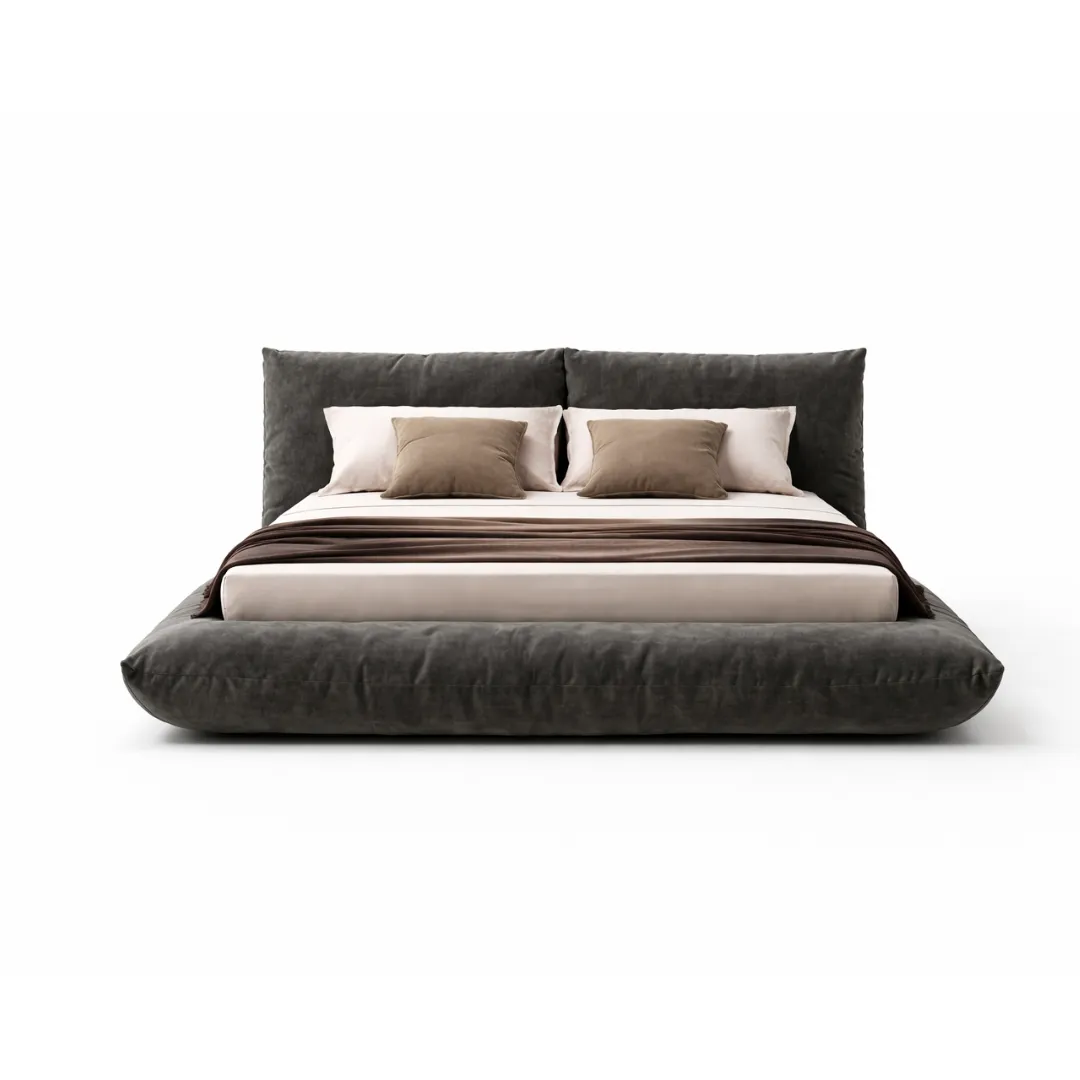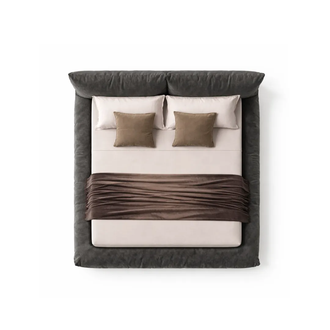 Sua estrutura imponente e macia da Cama Pillow cria um efeito visual envolvente, como um abraço que percorre toda a peça. A cabeceira ampla e os contornos suavemente inflados reforçam a sensação de aconchego. Estética contemporânea e elegante, ideal para quartos que priorizam conforto sensorial sem abrir mão do design autoral.