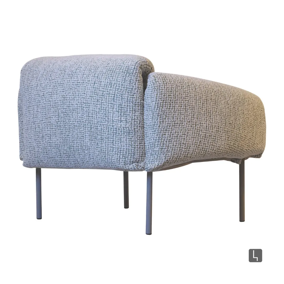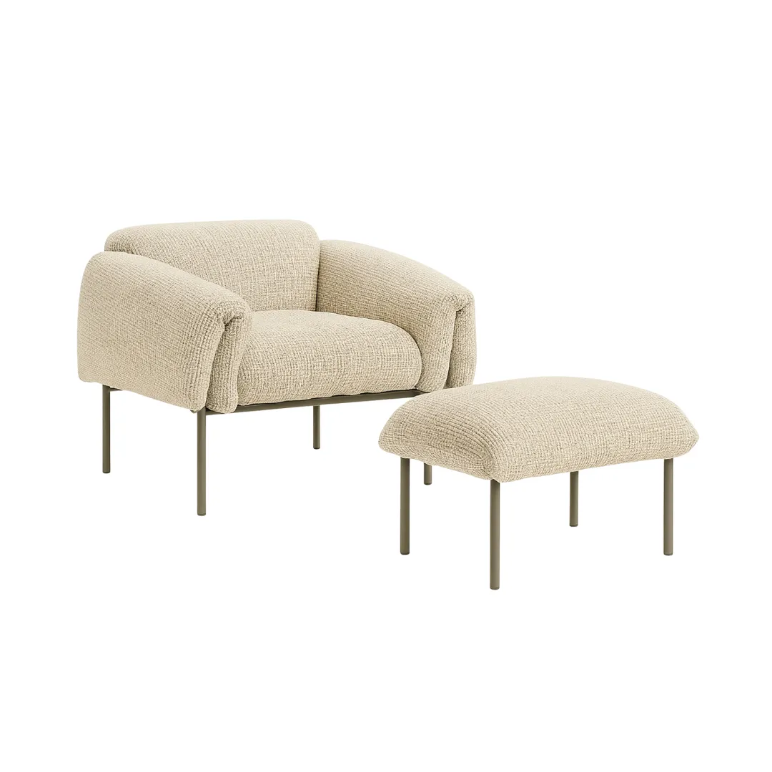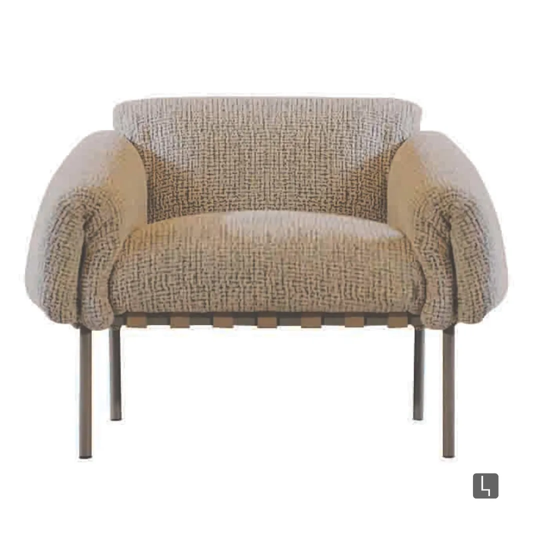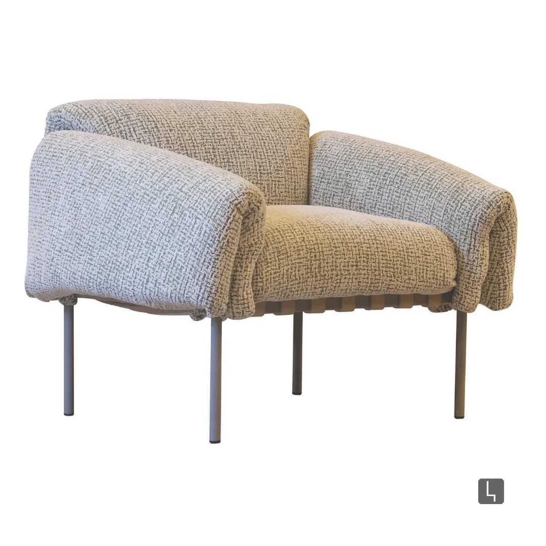 Design descontraído com formas amplas e acolhedoras, encosto e braços generosos que parecem “vestir” a estrutura. A base metálica esbelta contrasta com o volume macio, criando leveza e elegância contemporânea.