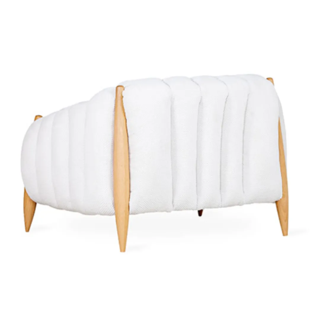 Linhas orgânicas que se fecham em um abraço contínuo, com costuras que desenham movimentos suaves. A madeira torneada em pontas elegantes completa a peça como escultura viva, unindo conforto e poesia ao ambiente.