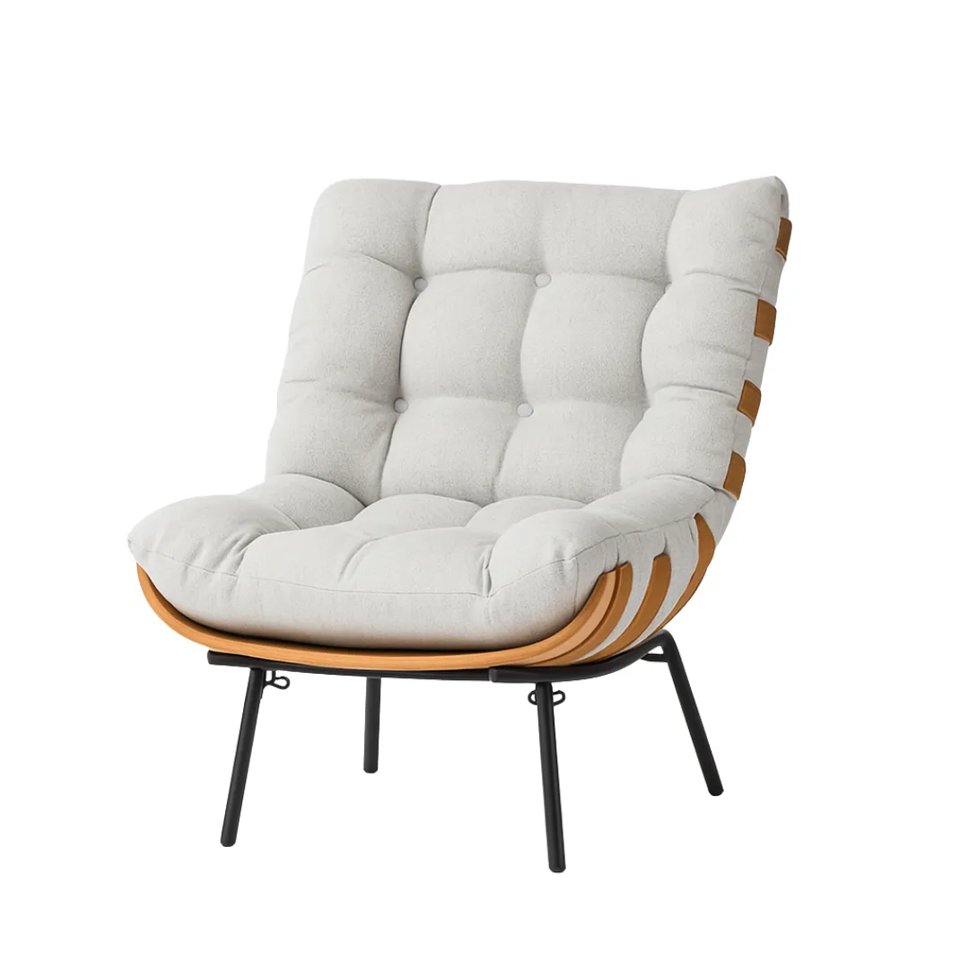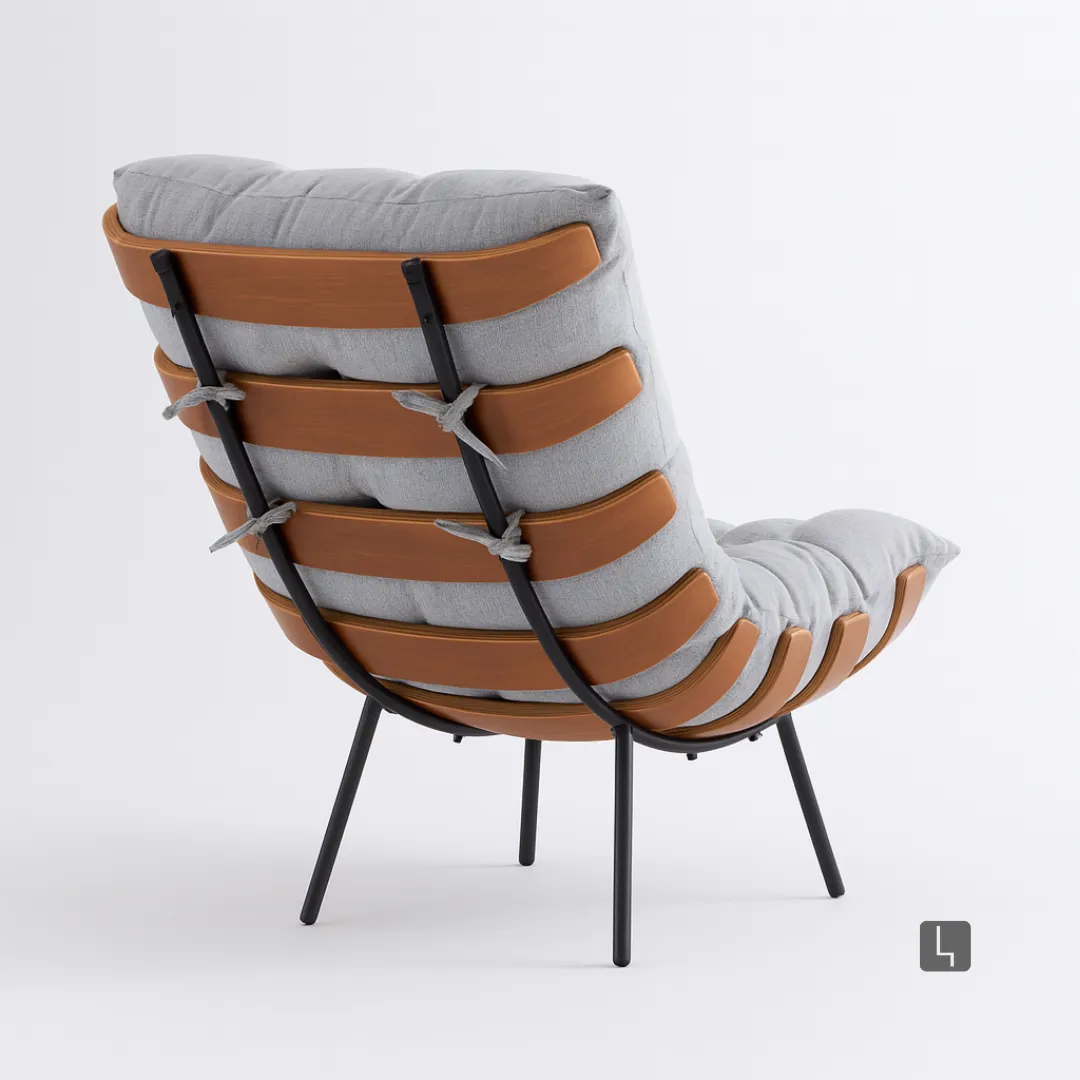 Com estrutura metálica, a poltrona combina couro e tiras laterais para um visual robusto, elegante e acolhedor.
