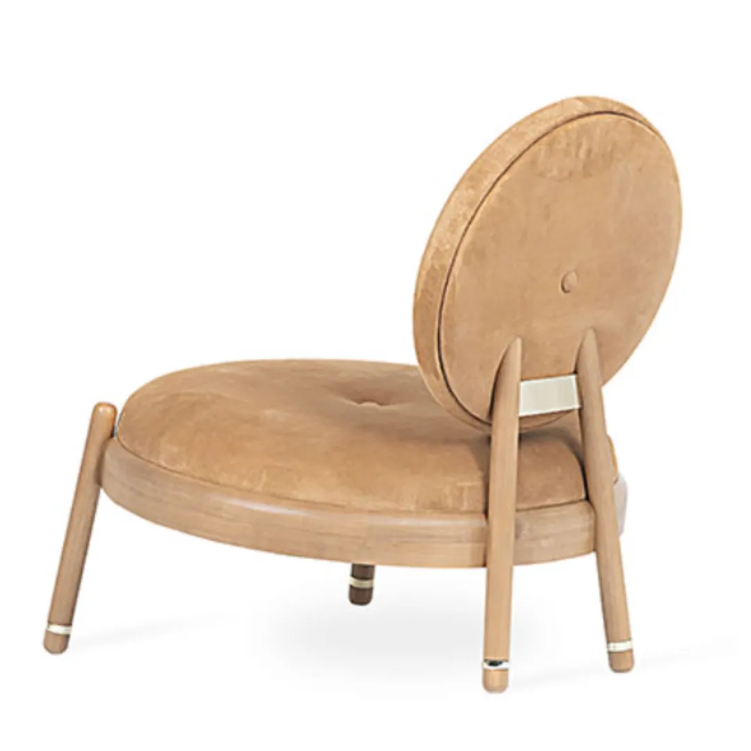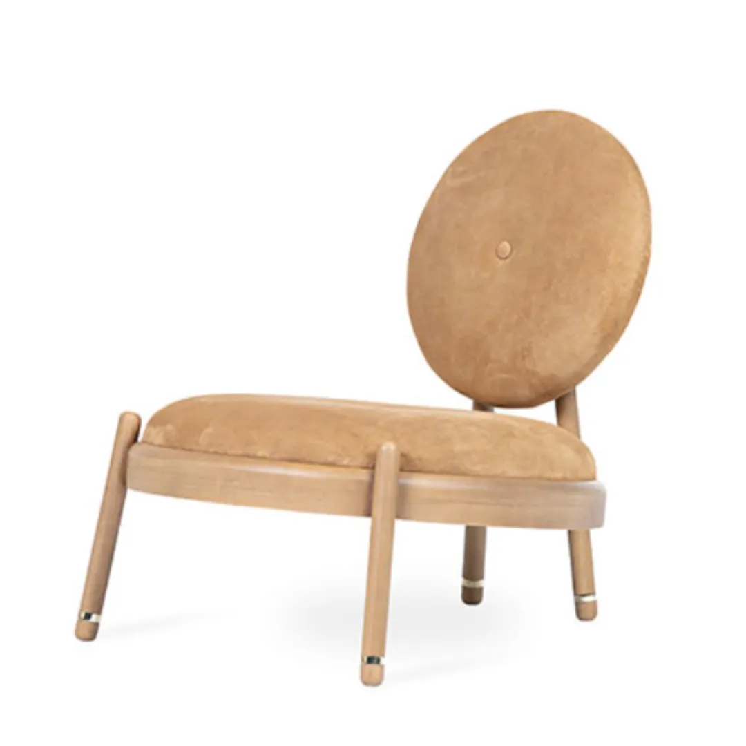 Design lúdico e elegante com encosto redondo e base em madeira aparente. As formas suaves e proporções baixas criam um visual descontraído e sofisticado.