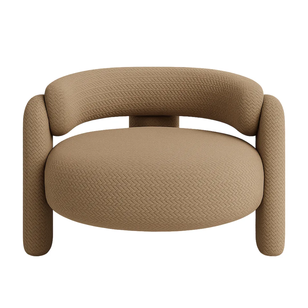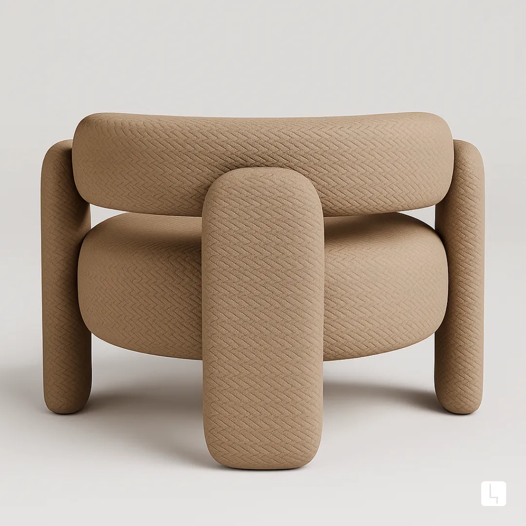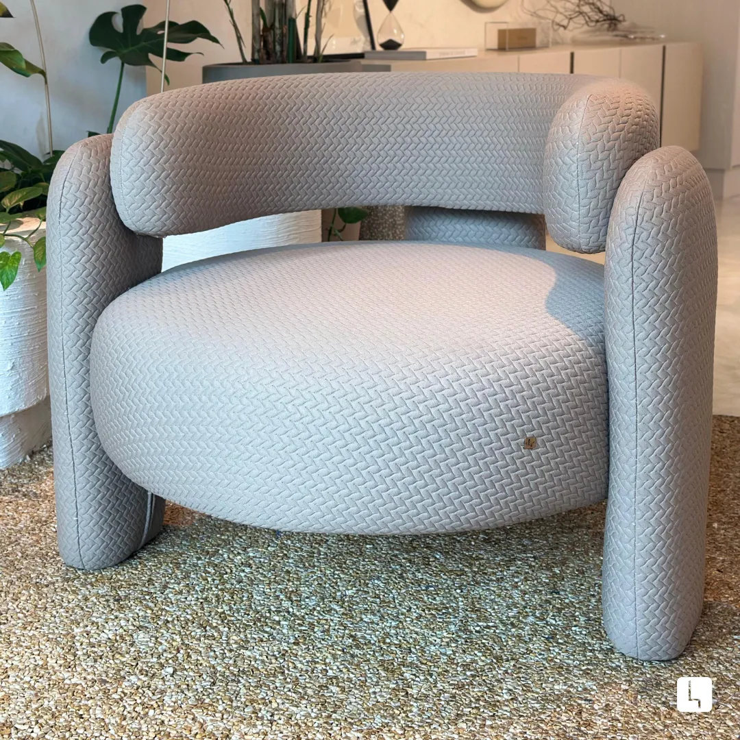 Design escultural com três apoios marcantes, toda estofada em formas arredondadas para conforto absoluto e presença imponente.